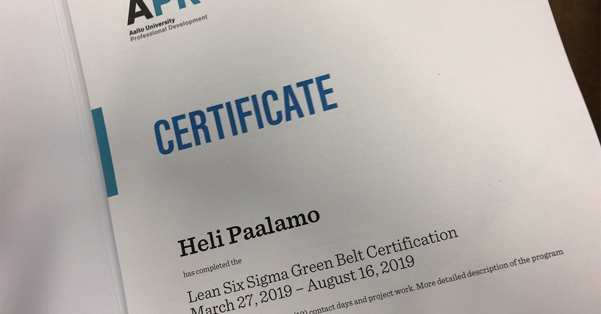 Laatumaailma oli tullut tutuksi jo Teknillisen korkeakoulun täydennyskoulutusohjelman Master of Quality suorittamisen myötä vuonna 2007 sekä lukuisten Aalto EE:n Lean ja Six Sigma -koulutusten vetovastuun kautta. Entäpä jos laittaisinkin nyrkit saveen ja lähtisin selvittämään, mitä parannettavaa löytyisi tutuista prosesseista ja miten Lean Six Sigmaa sovelletaan ongelmanratkaisuun? Motivaationi oli omaksua lisätyökaluja laatu- ja lean-oppien täydennykseksi. Vuosien varrella Lean Six Sigma Green Belt -oppeja oli jo tarttunut mukaan, mutta tietoihin oli jäänyt harmaita vyöhykkeitä ja puuttuvia palasia. Tähän halusin täydennystä ja sitä myös sain.