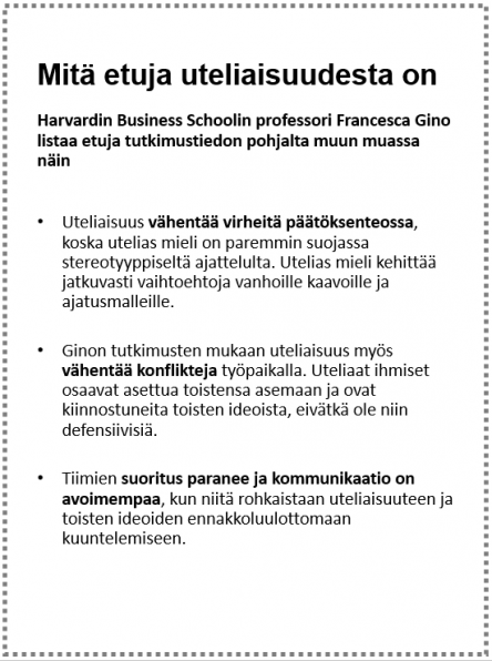 Uteliaisuus liittyy tähän ihan suoraan: utelias ihminen haluaa oppia uutta, janoaa uusia näkökulmia ja taitoja, haluaa kurkistaa jokaisen nurkan taakse. Moni työ vaatii omien taitojen soveltamista uudessa tilanteessa. Utelias suhtautuu epävarmuuteen enemmän innon kuin huolen kautta. Hän hahmottaa nopeasti uuden kontekstin, nuuskii joka suuntaan, ottaa selvää, kyselee.