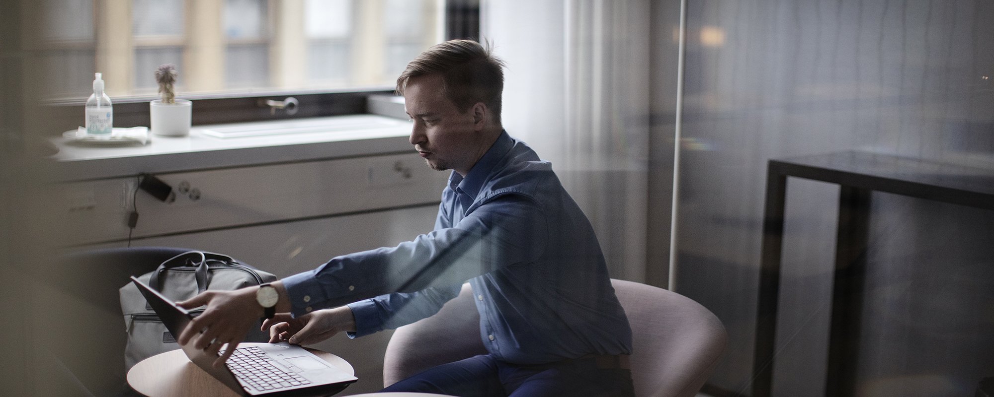 ”Vitsit oli mahtavaa istua kesällä 2020 työkavereiden kanssa samassa pöydässä. Luulen, että moni tulee toimistolle ajatellen, että mitä jos kahvikoneella taas törmäisi siihen hyvään tyyppiin”, Helsingin yliopiston oikeustieteellisessä tiedekunnassa opiskeleva Juuso Lumilahti muistelee. Hän on yksi Hannes Snellmanin knowledge management - harjoittelijoista ja tekee töitä Tech and Innovation -tiimissä.