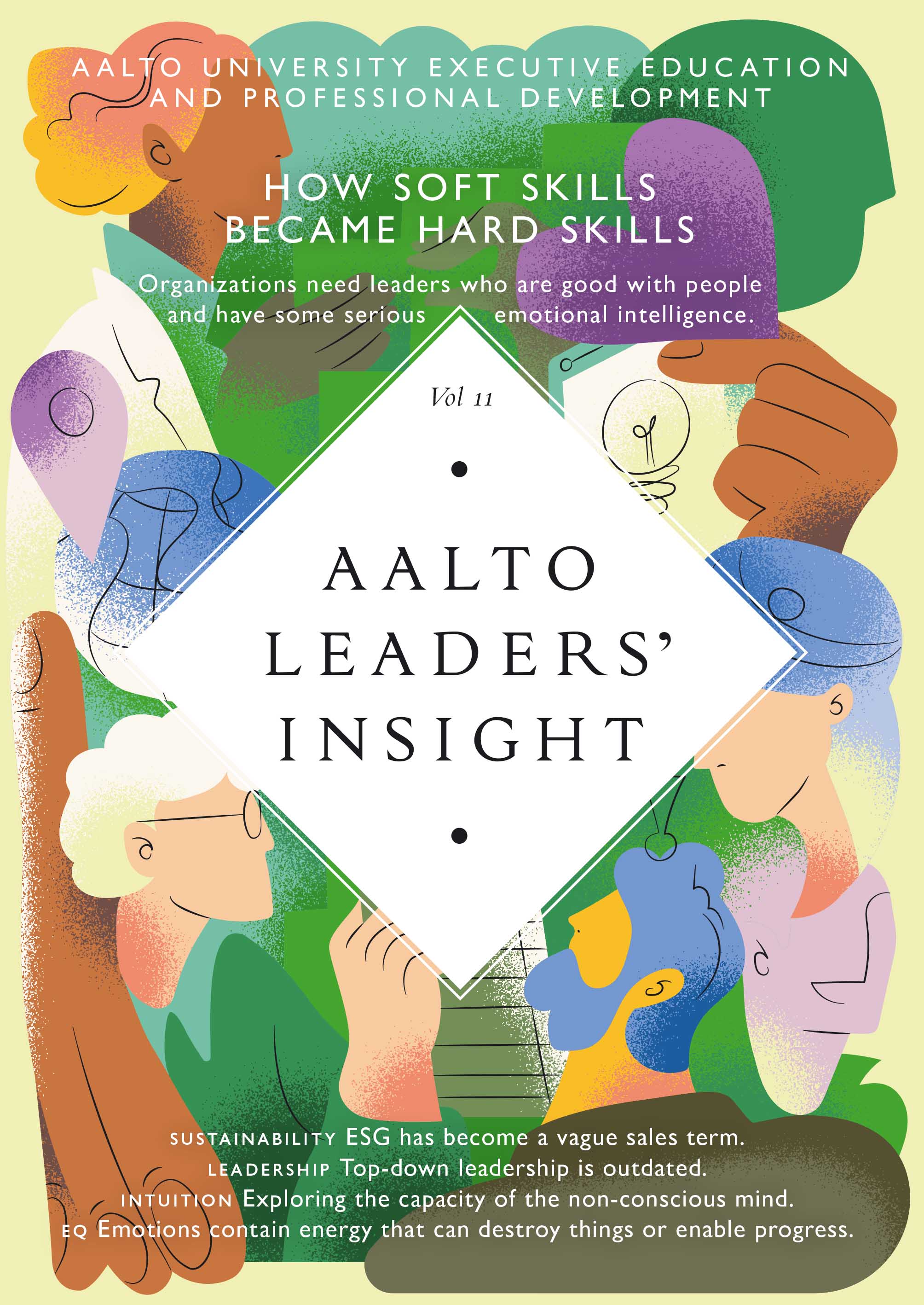 Aalto Leaders' Insight on kokoelma ajatuksia herätteleviä näkemyksiä johtamisesta, työelämästä ja osaamisen kehittämisestä. Uusimmassa numerossa tarkastellaan muun muassa intuition roolia johtamisessa, tunteiden voimaa organisaatioissa, ESG:tä maailman pelastaja vai sittenkin epämääräinen myyntiterminä, sekä sitä miksi hierarkinen johtaminen on vanhentunut ja millaisia vaatimuksia nykypäivän ja tulevaisuuden osaajilla on johtamiselle. Lehti on luettavissa englanniksi.