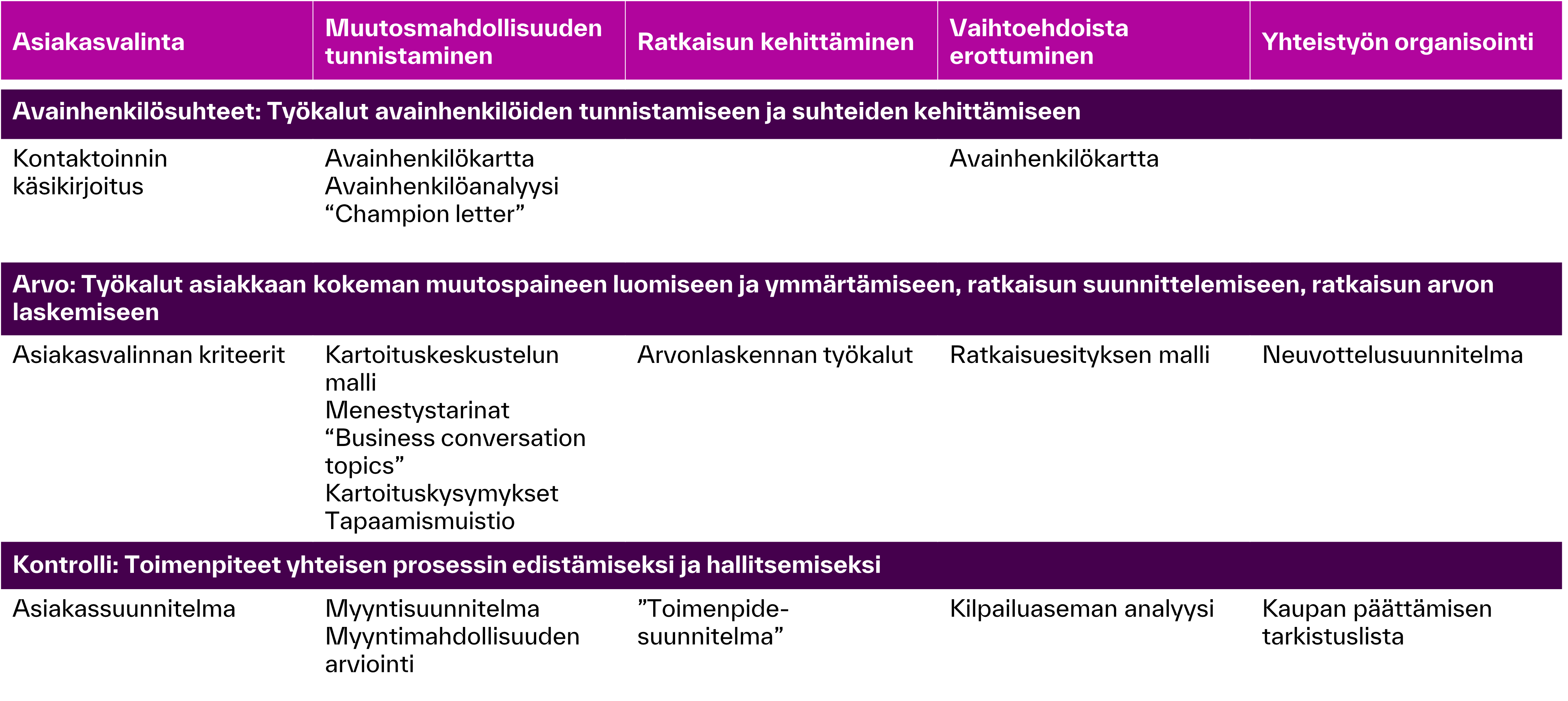 Key Account Managerin työkaluja avainhenkilösuhteiden kehittämiseen, yhteisen arvonluontimahdollisuuden tunnistamiseen, sekä yhteistyöprosessin hallintaan.