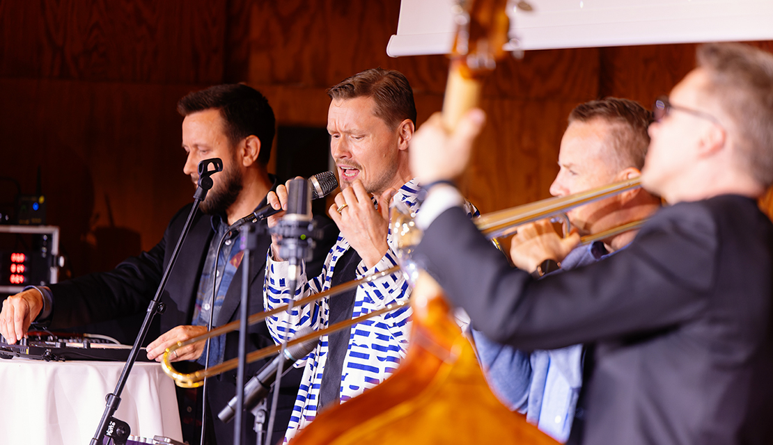 | Tekoäly ei vie ammattimuusikoiden työtä vaan parhaimmillaan rikastaa sitä Tilaisuuden musiikista vastasi Artfully Intelligent Ensemble – AIE eli Aki Himanen (vas.), Antti Koivula, Antti Rissanen ja Patrick Furu. |