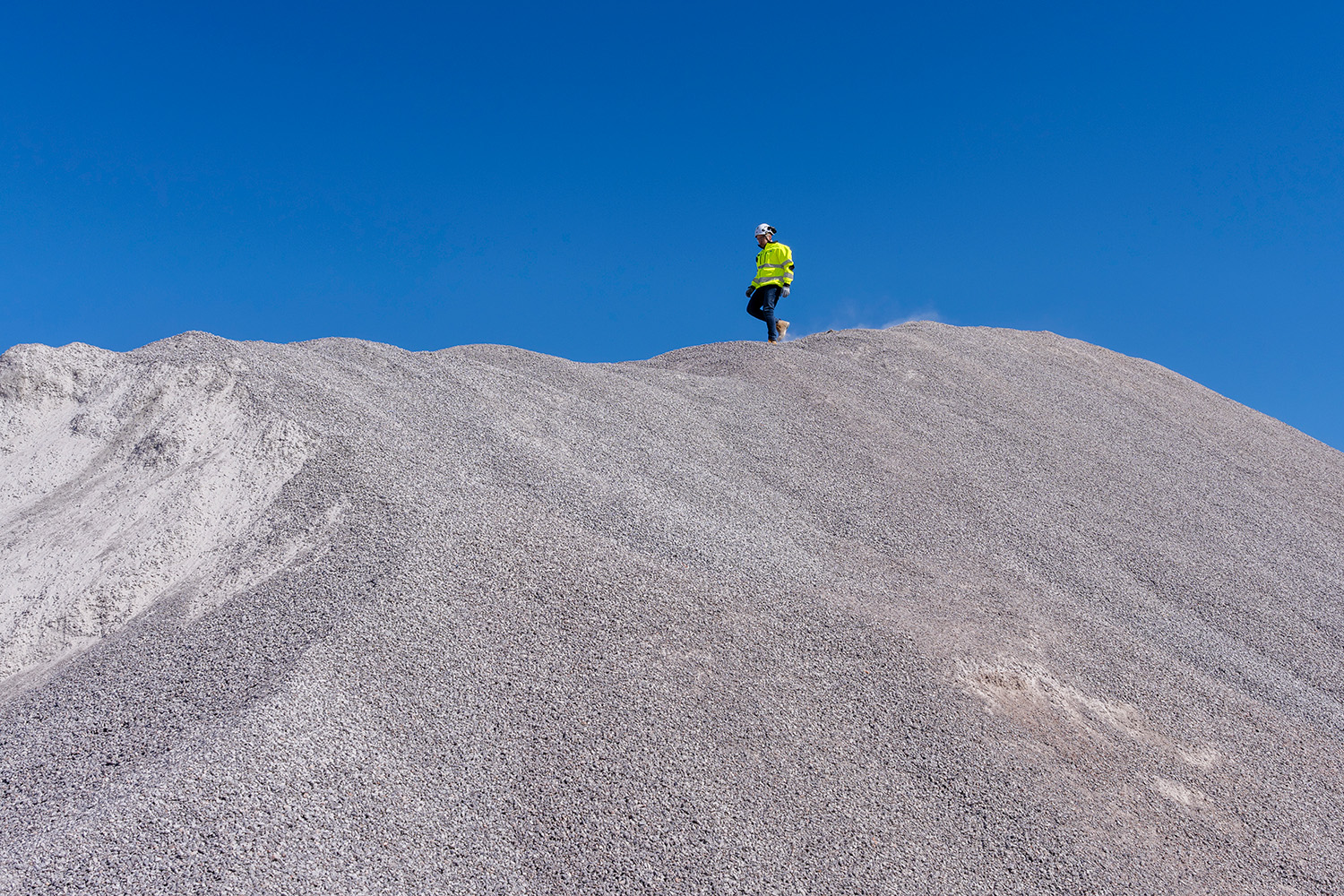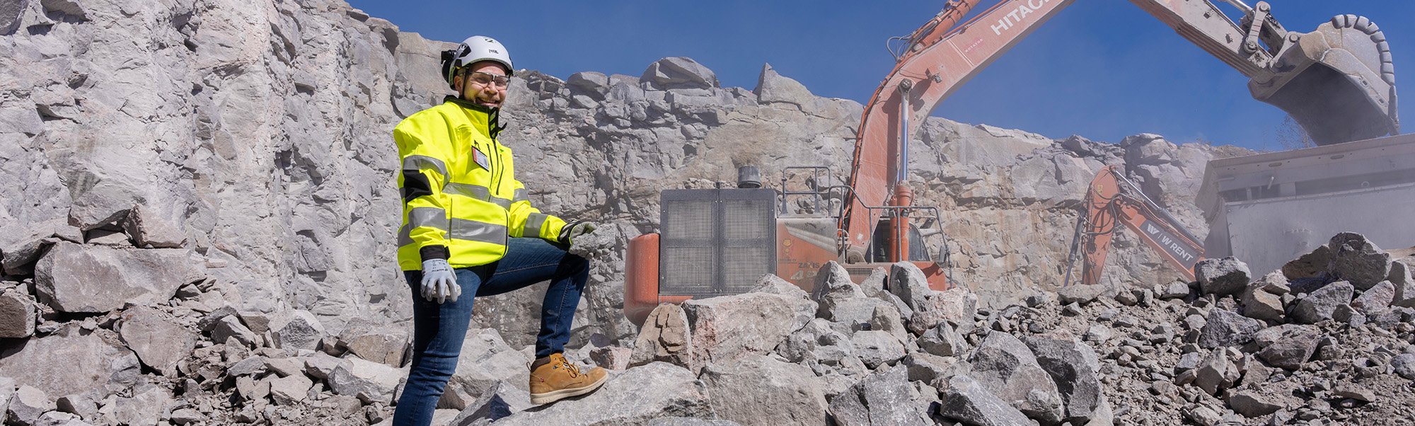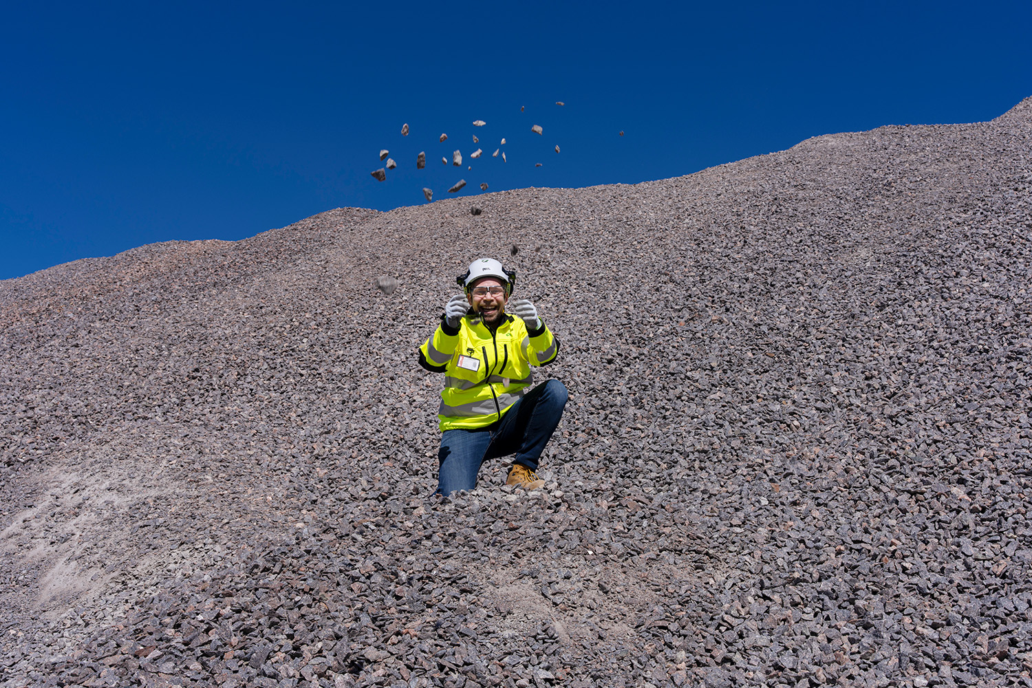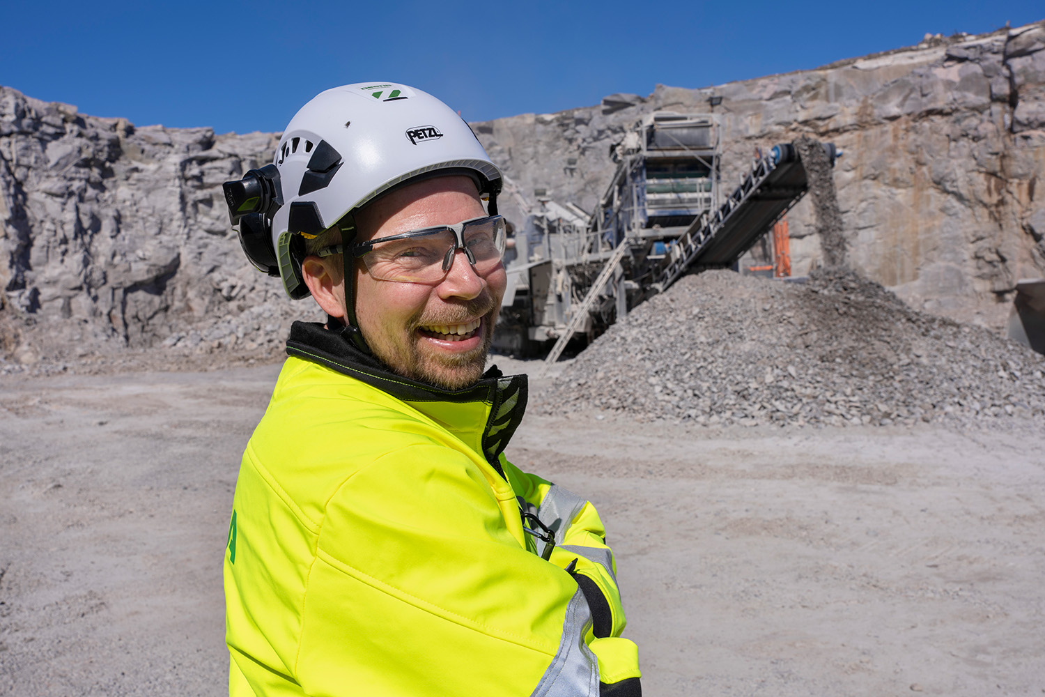Vietän paljon aikaa myös asiakkaidemme ja yhteistyökumppaneidemme kanssa. Kuvissa olen Kirkkonummella kalliokiviainesalueella, missä kiveä murskataan eri kokoisiksi tuotteiksi.