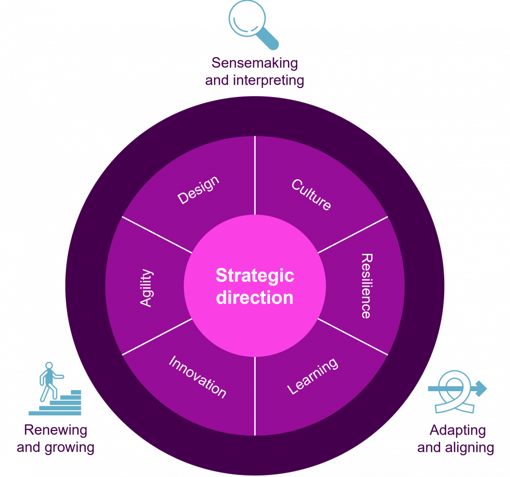 And finally: agility. At the risk of the term being somewhat overused, it describes an organization’s situational awareness in a unique way. Agility is the ability to change direction and thought patterns quickly, if need be, and react to what goes on in the surrounding world. Agility is of course also part of culture, and organizational design and structures enable it.