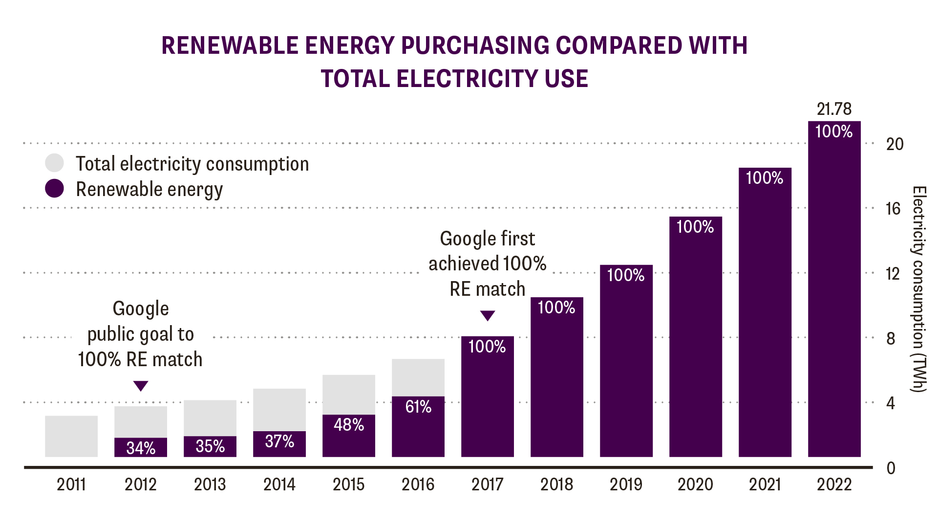 | Google's renewable energy purchasing compared with total electricity use |