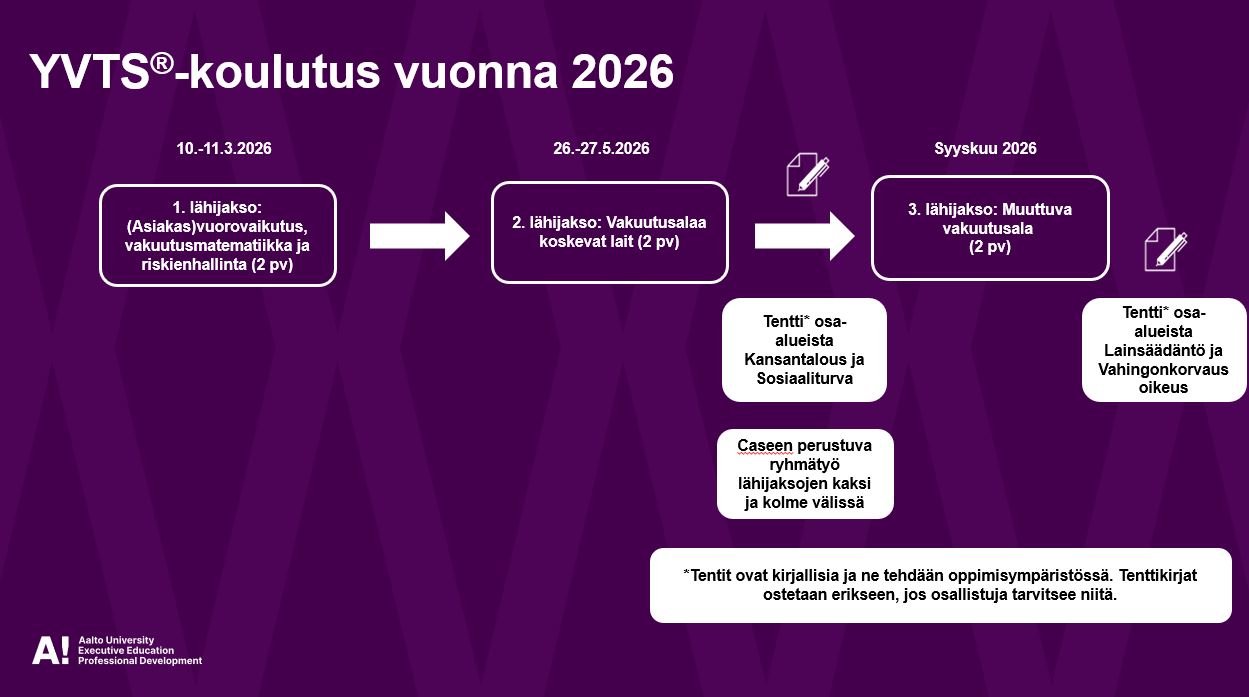 Liveopetusjaksoissa kuulet vakuutusalan ja Aalto-yliopiston huippuasiantuntijoiden luentoja. Kaksipäiväisiä jaksoja on kolme eli yhteensä kuusi päivää. Jaksot järjestetään paikan päällä Helsingissä. Jaksojen rytmitys on maaliskuu, toukokuu ja syyskuu.